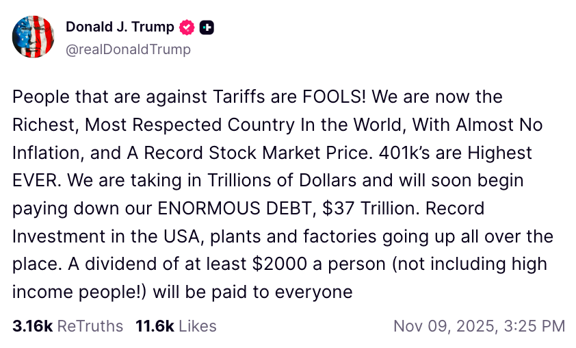 Trump'ın uluslararası tarifelerine bağlı olan bu ödeme, Truth Social'daki bir gönderide duyuruldu.