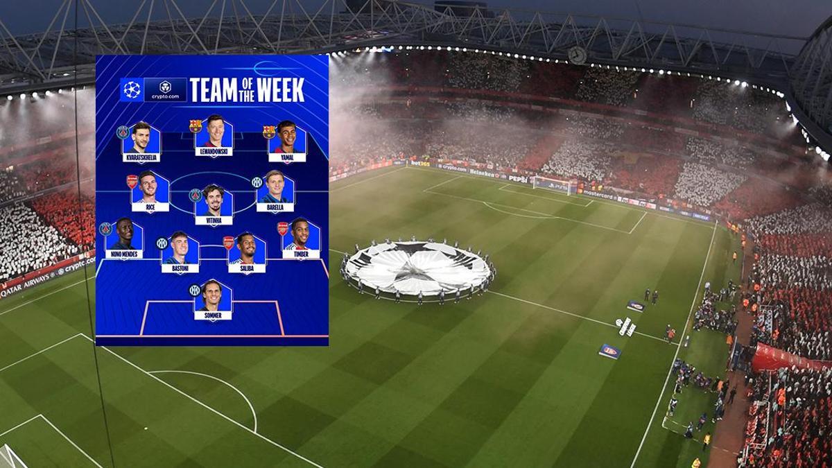 Yann Sommer (Inter), Jurrien Timber (Arsenal), William Saliba (Arsenal), Alessandro Bastoni (Inter), Nuno Mendes (PSG), Nicol Barella (Inter), Vitinha (PSG), Declan pirinç (Arsenal), lamin yamal (barcelona), khvicha kvaras) (Arsenal), Lamin) Yamal (Barselona), Khvicha Kvaratskhelia, Robert. (Barcelona).